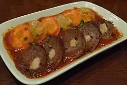 Meat dish | A beef roulade often prepared for special occasions it consists of thin sheets of cooked eggs and marinated beef layered one on top of the other, then wrapped and tied around carrots, celery, cheese, pork fat, and sausage. This is then cooked in seasoned tomato sauce. | |