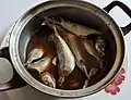 Paksiw | Generally means to cook and simmer in vinegar. Common dishes bearing the term, however, can vary substantially depending on what is being cooked. Paksiw na isda is fish poached in a vinegar broth usually seasoned with fish sauce and spiced with siling mahaba and possibly containing vegetables. Paksiw na baboy is pork, usually hock or shank, cooked in ingredients similar to those in adobo but with the addition of sugar and banana blossoms to make it sweeter and water to keep the meat moist and to yield a rich sauce. Paksiw na lechon is roasted pork lechon meat cooked in lechon sauce or its component ingredients of vinegar, garlic, onions, black pepper and ground liver or liver spread and some water. The cooking reduces the sauce so that by the end the meat is almost being fried. | |||