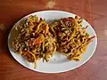 Meat/Vegetable dish | A variant of spring rolls, either deep or pan fried (prito), or fresh (sariwa). Popular versions include lumpiang shanghai, a fairly narrow fried roll usually with a meat filling, often accompanied by a sweet chili dipping sauce, and lumpiang ubod, a wider, fresh spring roll filled with raw vegetables local to the area. | |