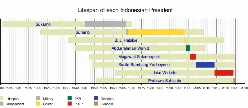 - ^ Suharto was acting president until 27 March 1968 (381 days), when he was made full president