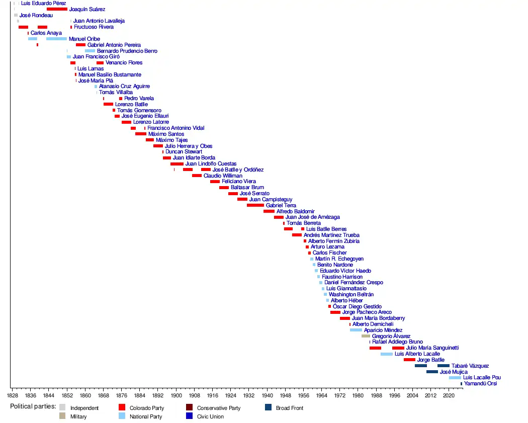 Most of the presidents of Uruguay have belonged to the Colorado Party, a traditionally conservative party founded by Rivera in 1836, although there has not been a Colorado president since Jorge Batlle left office in 2005. The first free democratic elections for president were held in 1922. The current president is Yamandú Orsi of the Broad Front, who was elected in the 2024 presidential election.