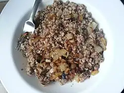 A dish invented by the French[25] consisting of braised loin of veal, thinly sliced, filled with a thin layer of pureed mushrooms and onions between each slice, topped with bechamel sauce and cheese. Various versions of this dish usually go by the name French-style meat in Russia today.