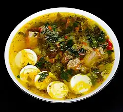 Cold soup of mostly raw vegetables like cucumbers, spring onions, boiled potatoes, with eggs, and a cooked meat such as beef, veal, sausages, or ham with kvass, topped with sour cream[8]