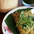 Colloquially also known as pizza doi (Thai: พิซซาดอย, literally: "mountain pizza"). This is a dish of Shan people. This version uses steamed egg and vegetables as the filling for the steamed rice wrap. The whole is dusted with crushed peanuts. | ||