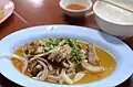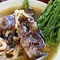Egg noodles served "dry" with slices of braised duck, and often, as shown on the image, together with "blood tofu". The broth is served on the side. It is originally a Chinese dish. | |
