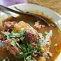 A soup of Chinese origin, usually containing offal, often pork liver and intestines, also boiled eggs, and other meats such as crispy pork. Alternatively, at regular noodle soup shops, it can also be as a regular Thai-Chinese noodle soup but then served without any noodles. | ||