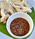 Fried pla thu served with nam phrik kapi, a pungent dip made mainly from shrimp paste and chili peppers, and raw, steamed or fried vegetables (often pieces of cha-om omelette). It is eaten with khanom chin (Thai rice noodles) or steamed rice. Although the name of this dish is often shortened to nam phrik pla thu, this refers to a certain type of chili paste in which pla thu is used as an ingredient. | ||
