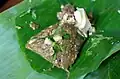 The dish is made by wrapping sweet banana and sticky rice inside a banana leaf and then steaming it. The banana takes on a pink color after steaming. | ||