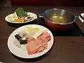 Mu kratha resembles a combination of a Korean barbecue and a Chinese hot pot. Meat (most often pork) is grilled in the center while the vegetables and other ingredients, such as fish balls, cook in the soup. It is served with a variety of nam chim (Thai dipping sauces). | ||
