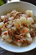 Central | Cold rice noodles served as a salad with thick coconut milk, finely chopped pineapple, sliced raw garlic and Thai chili peppers, pounded dried prawns, shredded ginger, lime juice, fish sauce, and sugar. | |