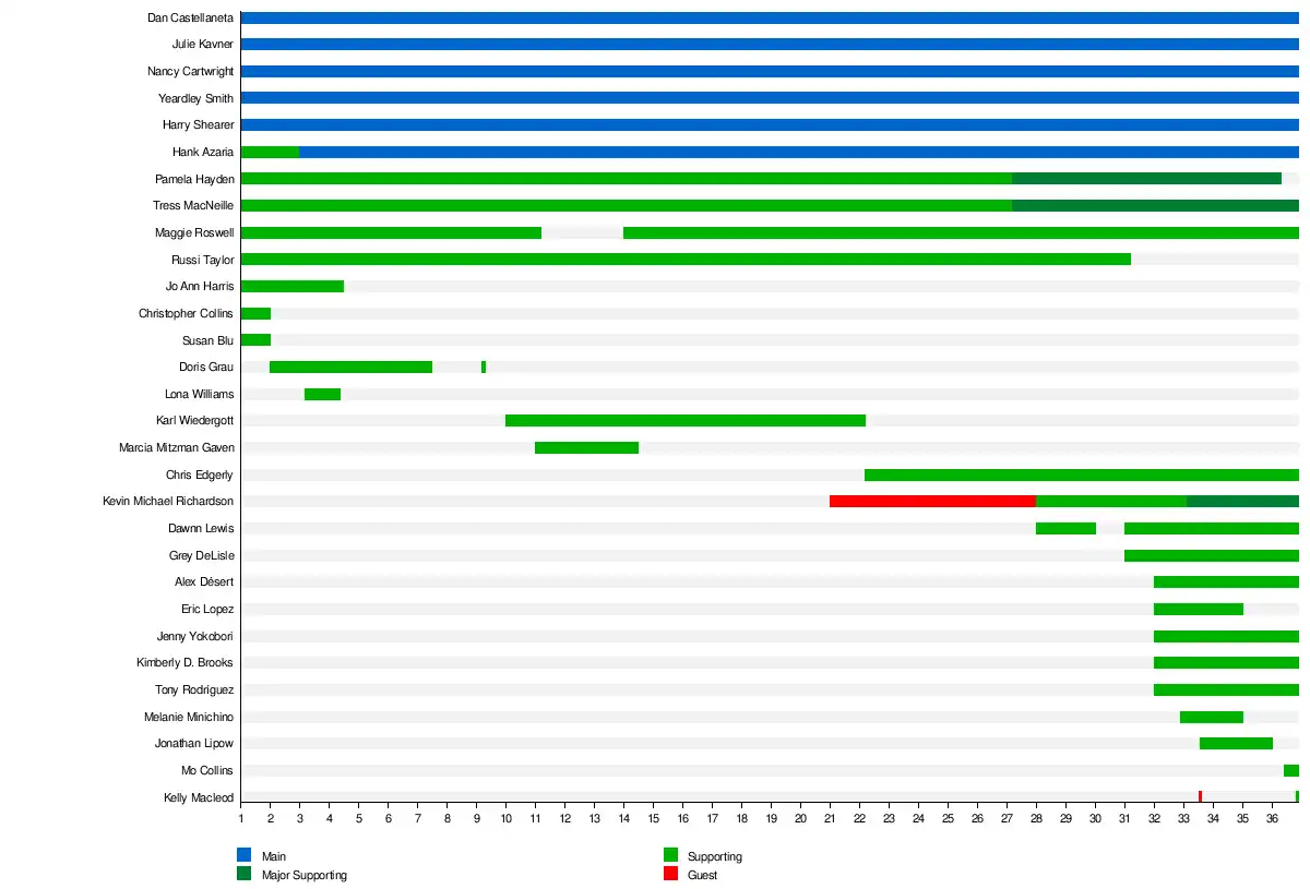 Guest stars have appeared on The Simpsons since its first season, in addition to the show's main cast of Dan Castellaneta, Julie Kavner, Nancy Cartwright, Yeardley Smith, Hank Azaria and Harry Shearer and supporting cast of Tress MacNeille, Maggie Roswell, Chris Edgerly, Dawnn Lewis, Grey DeLisle, Alex Désert, Jenny Yokobori, Kimberly D. Brooks, Tony Rodríguez, Mo Collins and Kelly Macleod and former supporting cast members Jo Ann Harris, Russi Taylor, Christopher Collins, Susan Blu, Lona Williams, Doris Grau, Marcia Mitzman Gaven, Karl Wiedergott, Melanie Minchino, Jonathan Lipow, Eric Lopez and Pamela Hayden.[2] Kevin Michael Richardson started as a recurring guest star in the twenty first season, but joined the supporting cast in the twenty eighth, starting with the episode "The Last Traction Hero".