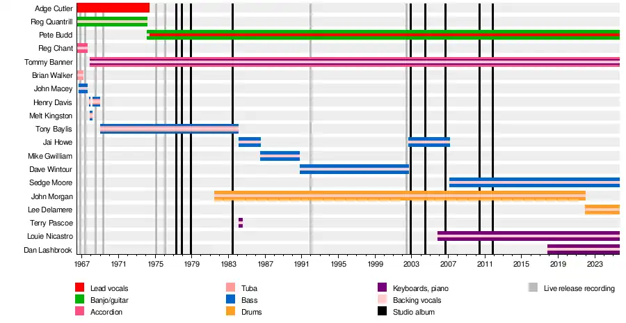Adge Cutler | 1966–1974 (died 1974) | lead vocals | all Wurzels releases from Scrumpy & Western (1967) to "Little Darlin'" (1972) | |
