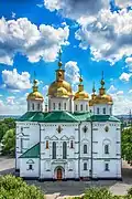 Dormition Cathedral of the Kyiv Pechersk Lavra | Pechersk, Kyiv | 1669–1677, 1722–1729, 1767–1769[26] | The medieval church was significantly rebuilt: chapels and porches were added, six new side domes were built, and the exterior and interior were redecorated. It incorporates elements of the Elizabethan Baroque. The cathedral was almost entirely ruined in 1941, and rebuilt in the 1990s to match the style of the 18th century. | ![]() |