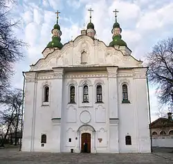 Dormition Cathedral of Yelets Dormition Monastery | Chernihiv | 1670s–1680s | The medieval church was rebuilt by Theodosius of Chernihiv and Ioanikiy (Galyatovsky) at the expense of numerous noble families, including the Lyzohubs and the Baryatynskys. Three cupolas were added above the narthex (of which two have been preserved), and one more above the altar. It was expanded in 1689. The bell tower was built in 1670–1675. The iconostasis was made in 1669–1670 and lost in the 1920s.[6] | ![]() |