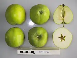 Sussex, England | Late 1700s | Raised at Uckfield Sussex by Mr Shepherd. A large acid green apple. Flesh; pale yellow, crisp, yellow, subacid, pear-like flavour. Cells elliptical, abaxile. Award of Merit from RHS in 1920. Width 83 mm (3.3 in), height 76 mm (3.0 in). | Cooking, Juice | PickE early October; use November–April |