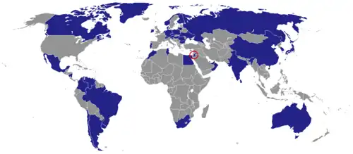 - ^ a b c d e f g h i j k l m n o p q r s t u v w x y z aa ab ac ad ae af ag ah ai aj ak al am an ao ap aq ar as at au av aw ax ay az ba bb bc bd be bf bg bh bi bj bk bl bm bn bo bp bq br bs bt bu bv bw bx by bz ca cb cc cd ce cf cg ch ci cj ck cl cm cn co cp cq cr cs ct cu cv cw cx cy cz da db dc dd de df dg dh di "Diplomatic List 2025" (PDF). Protocol Department, Ministry of Foreign Affairs and Expatriates of the State of Palestine. February 2025. Retrieved 28 May 2025.