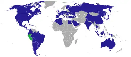 - ^ a b c d e f g h i j k l m n o p q r s t u v w x y z aa ab ac ad ae af ag ah ai aj ak al am an ao ap aq ar as at au av aw ax ay az ba bb bc bd be bf bg bh bi bj bk bl bm bn bo bp bq br bs bt bu bv "Guía diplomática y lista de organismos internacionales y cuerpo consular" [Diplomatic guide and list of international organizations and consular corps]. Government of Peru (in Spanish). General Directorate of State Protocol and Ceremonials of the Ministry of Foreign Affairs of Peru. 14 May 2025. Retrieved 21 May 2025.