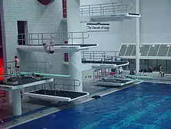 This is a list of diving facilities, especially those including 10-meter diving platforms. This is usually the last feature of an athletics complex required for training and competition in the full program of Olympic swimming and diving. In the United States, a 10-meter platform is required for full NCAA competition,[1] although two schools may hold a dual NCAA meet at a facility lacking one if both schools agree. Organizations that set standards for diving facilities include FINA which governs international competitions, and, in the United States, NFHS, NCAA, and USA Swimming. A typical requirement for indoor facilities is that they must provide 5 metres (16 ft) clearance above the highest diving board or platform, so that divers do not hit a ceiling structure.[1]