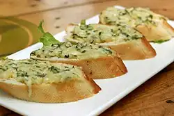 This is a list of garlic dishes, comprising dishes and foods that use garlic as a main ingredient. Garlic is a species in the onion genus, Allium. Its close relatives include the onion, shallot, leek, chive,[1] and Chinese onion.[2] Garlic is native to Central Asia and northeastern Iran, has a history of several thousand years of human consumption and use, and has long been used as a seasoning worldwide.[3][1] It was known to Ancient Egyptians, and has been used both as a food flavoring and as a traditional medicine.[4]