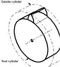 The root cylinder is the imaginary surface that coincides with the bottoms of the tooth spaces in a cylindrical gear.[1]