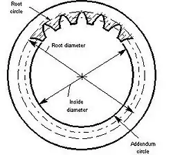 The root circle coincides with the bottoms of the tooth spaces.[1]