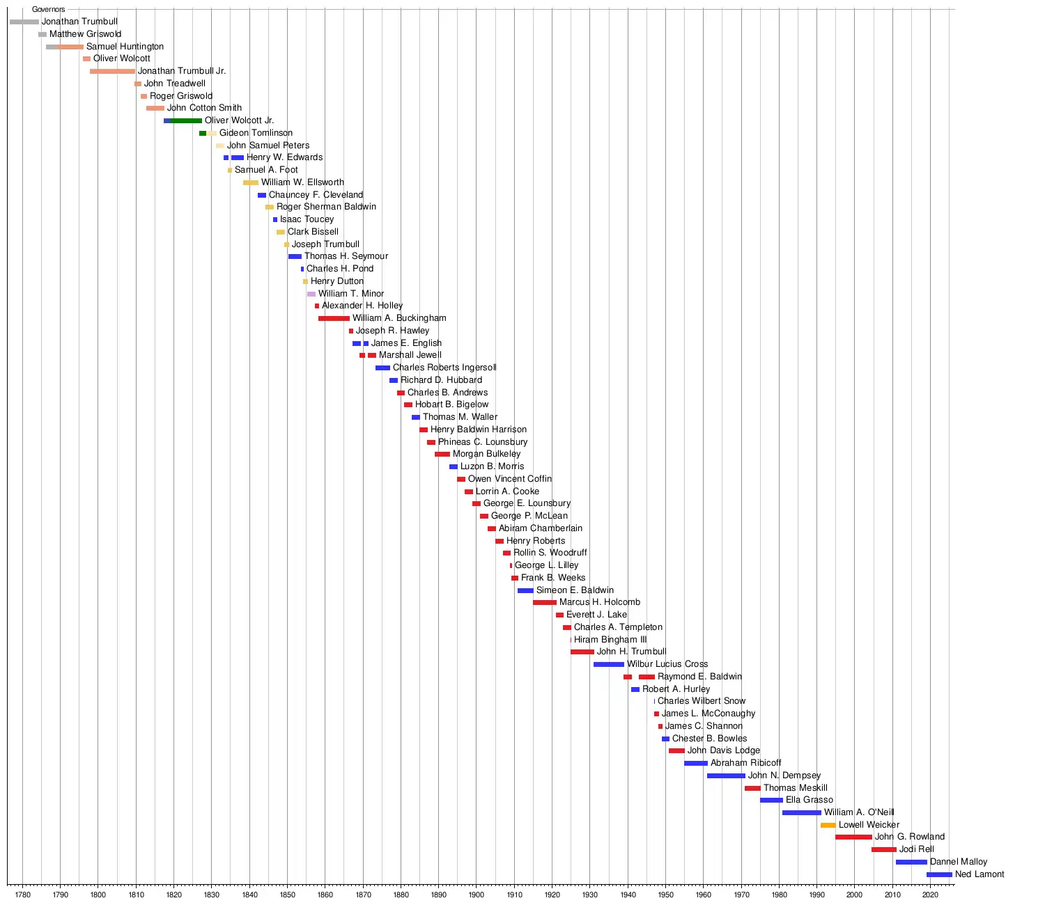 - ^ According to the Connecticut State Library, the official listing goes back to the first governor of Connecticut Colony in 1639, and did not include repeat governors serving non-consecutive terms in the colonial period; this makes Trumbull the 16th governor.[13] The official numbering since statehood includes repeat and acting governors.