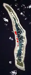 Pandanus Islet | 74,000 m2 | Pandanus, the largest and northernmost of the South Nake Islets, was named for a Pandanus grove present along its lagoon shore. Wooded over about two-thirds of its area, the islet appears to have increased in size significantly over Arundel's 19th-century charts, and is growing by accumulation of sand on the eastern edge. The western (seaward) shore also shows an unusually high amount of coral rubble. | |