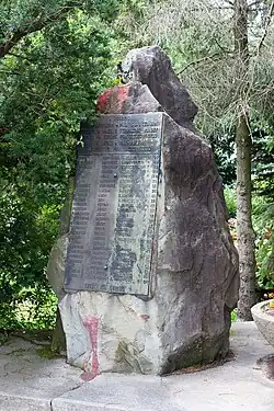- The National Remembrance Monument to Those Who Gave Their Lives for Poland was originally erected to commemorate the Red Army. Designed by Władysław Niemiec, it was unveiled on 22 July 1950 to mark Brzozów's liberation from German occupation on 3 August 1944.[4] The monument initially featured a star emblem and a plaque stating: "Eternal honor and glory to the heroes of the Red Army, fallen in the fight for the freedom of all peoples". In 1966, to mark the Millennium of the Polish State, a second plaque was added: "966–1966 – In memory of those fallen in the fight for People's Poland, Brzozów 16 April 1966". This plaque covered a niche containing an urn with soil from battlefields and execution sites. The monument was renovated in 1974 by the Brzozów County Commission for the Protection of Monuments of Struggle and Martyrdom.[1] In 1990, the Temporary Committee for the Construction of the National Remembrance Monument, under the Brzozów Branch of the World Association of Home Army Soldiers, was formed to transform the Red Army monument into one commemorating Those Who Gave Their Lives for Poland. Its activities were reported in the Cegiełkogazetki newsletter.[4] On 11 November 1992, the monument's name was changed to To Those Who Gave Their Lives for Poland 1939–1989. The unveiling was performed by Jan Salamak, a Home Army veteran and one of Brzozów's oldest residents, Mayor Józef Rzepka, and Town Council Chairman Lucjan Krynicki. The monument was consecrated by Father Julian Pudło, and a trumpeter played the Brzozów Anthem.[5] The redesigned monument, created by Adam Zarych from Blizne, features an eagle symbolizing the fight against fascism and communism.[4][6]
