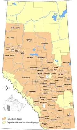 Despite their names, Lac La Biche County, Mackenzie County, and Strathcona County are not listed because they are in fact incorporated as specialized municipalities, not municipal districts. The Regional Municipality of Wood Buffalo is likewise a specialized municipality and is thus not listed here. For more information on specialized municipalities, see List of specialized municipalities in Alberta.