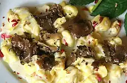 There are many different varieties of pasta.[1] They are usually sorted by size, being long (pasta lunga), short (pasta corta), stuffed (ripiena), cooked in broth (pastina), stretched (strascinati) or in dumpling-like form (gnocchi/gnocchetti). Yet, due to the variety of shapes and regional variants, "one man's gnocchetto can be another's strascinato".[2]