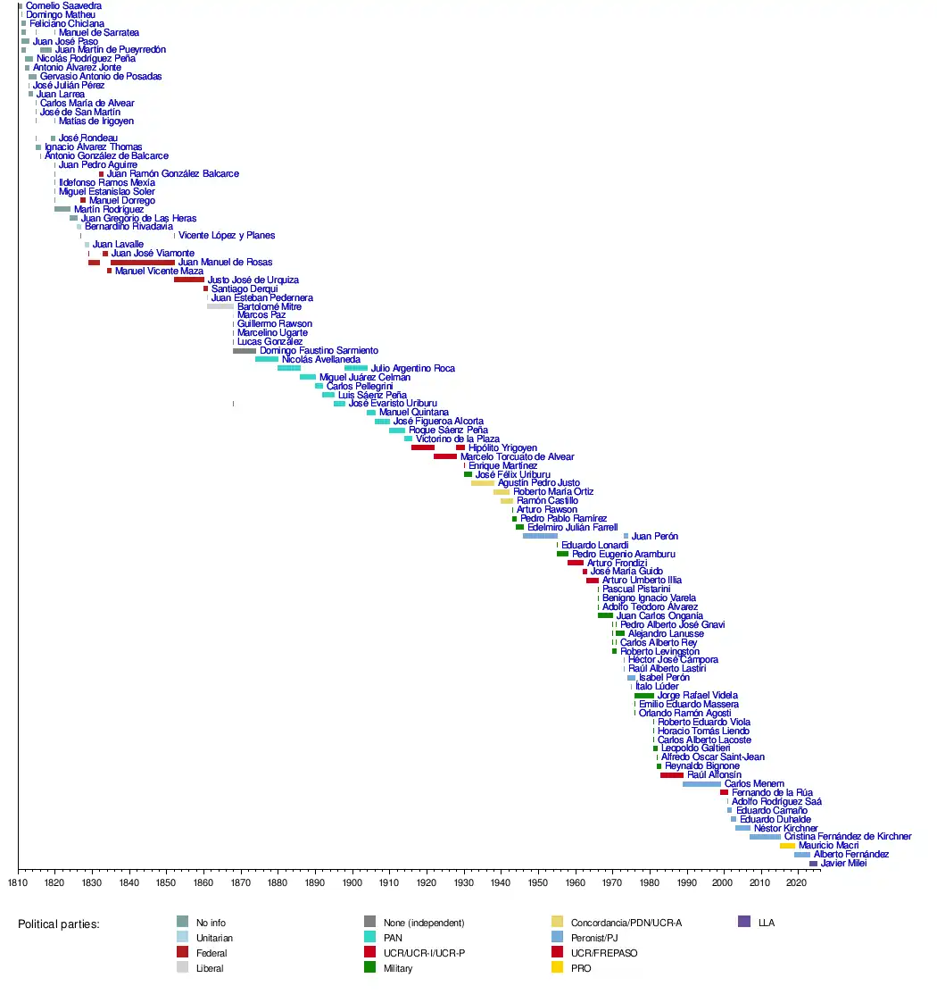 The succession line of constitutional presidents run uninterrupted until 1930, when José Félix Uriburu took government through a civic-military coup d'état. For many decades, there was an alternance between legitimate presidents and others that took government through illegitimate means. Those means included military coups, but also proscriptions of major political parties[6] and electoral fraud.[6][7] The last coup d'état occurred in 1976 and resulted in the National Reorganization Process, which ended in 1983. The retrospective recognition as presidents or heads of state of any de facto ruler that exercised its authority outside the Constitutional mandate is a controversial and relevant issue in Argentine politics.[8][9][10] However, their government actions were recognized as valid following the de facto government doctrine that used to legitimize them.[11] This doctrine was rejected by the 1994 amendment and would not be applicable for potential future coups. The current head of state is President Javier Milei, who took office on 10 December 2023.