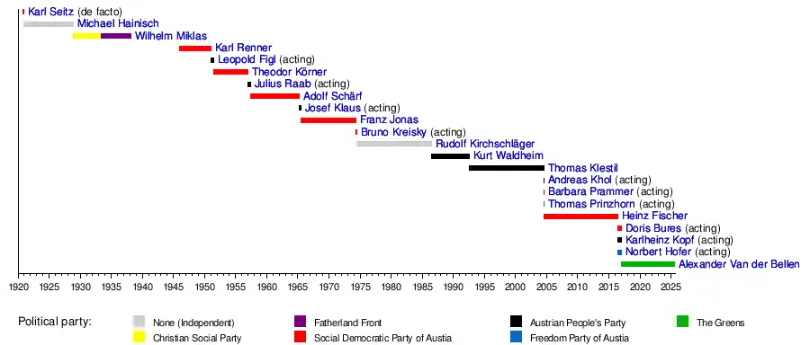 Alexander Van der Bellen (born 1944) | 26 January 2017 | Incumbent | 8 years, 206 days | Greens | 2016 2022 |