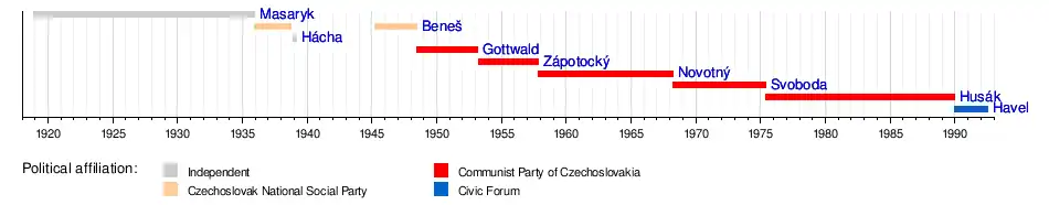 The second section lists the leaders of the Communist Party of Czechoslovakia (KSČ) from 1948 to 1989. The post was titled as chairman from 1948 to 1953, first secretary from 1953 to 1971, and general secretary from 1971 to 1989. After the 1948 coup d'état, the KSČ's leader held the real executive power in the country. However, three party leaders (Klement Gottwald, Antonín Novotný, and Gustáv Husák) also served as president at some point in their tenures.