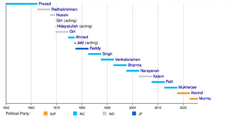 This list is numbered based on presidents elected after winning an Indian presidential election. The terms of V. V. Giri, Mohammad Hidayatullah and B. D. Jatti, who served as acting president are therefore not numbered or counted as actual terms in office. The president of India does not represent any political party.
