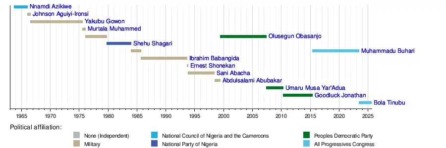 - ^ Akinpelu, Yusuf. "ANALYSIS: From bullet to ballot: 14 men who have led Nigeria since independence". Premium Times. Retrieved 27 March 2025.