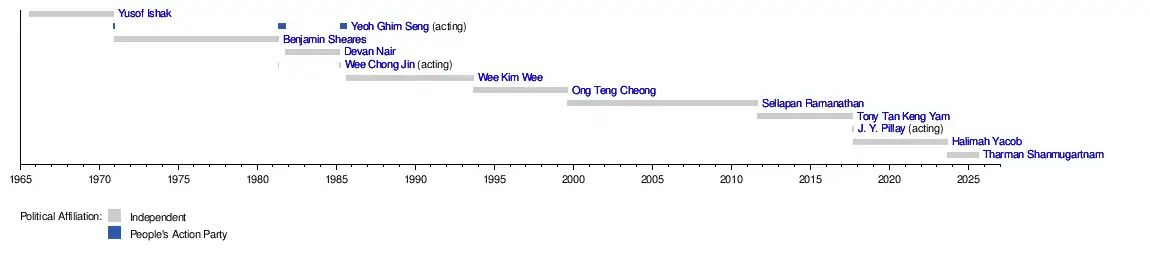 There have been nine presidents since Singapore gained independence in 1965. The term of president was previously 4 years, with it being extended to 6 years following the 1991 constitutional amendment.[13] Two presidents, Yusof Ishak and Benjamin Sheares, have died in office;[14][15] one president, Devan Nair, has resigned mid-term;[16] and the longest serving president is S. R. Nathan, at 12 years over two terms.[17]