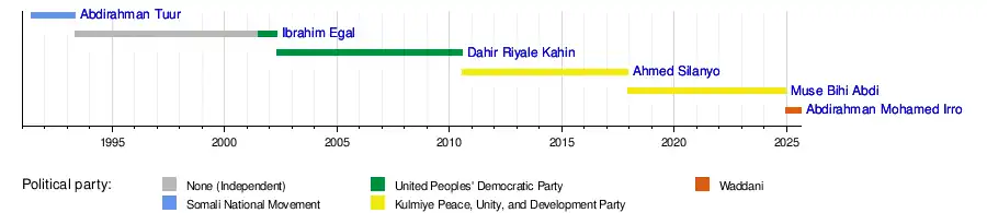 This is a list of presidents of the Republic of Somaliland, a de facto sovereign state in the Horn of Africa, considered internationally to be part of Somalia. The Republic of Somaliland regards itself as the successor state to British Somaliland, which was independent for a few days in 1960 as the State of Somaliland.[1][2] The President of Somaliland is the head of state and head of government of Somaliland. The president leads the executive branch of the Government of Somaliland and is the commander-in-chief of the Somaliland Armed Forces. The official residence of the president is the Presidential Palace in Hargeisa.