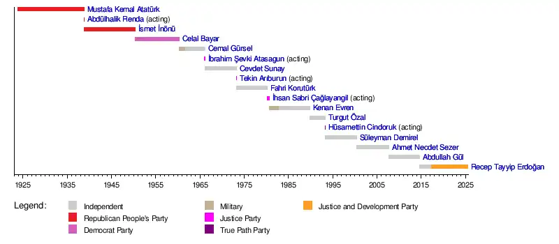 The following is a complete list of people who held the office of President of Turkey. There have been twelve heads of state since the inception of the republican period in 1923, following the Turkish War of Independence. For a list of rulers of the predecessor Ottoman Empire, see List of sultans of the Ottoman Empire.