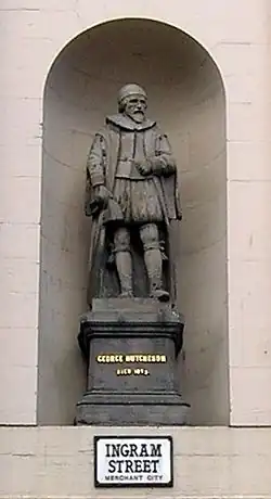 George Hutcheson | Former Hutchesons' Hospital, Ingram Street | 1649 | James Colquhoun | Statue in alcove | Stone | Category A | [31]
