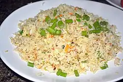 China | A popular Chinese-style wok fried rice dish in many Chinese restaurants in China, the Americas, Australia, United Kingdom, Vietnam, and the Philippines. The ingredients vary, but there are staple items such as cooked rice (preferably day-old because freshly cooked rice is too sticky, barbecued pork, Cooked shrimp, scallions (spring onions or green onions), chopped, including green ends and egg yolks. |