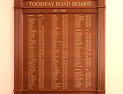 The local government area now known as the Shire of Toodyay was originally established on 24 January 1871 as one of the initial road districts under the District Road Boards Act 1871, with a chairman and councillors.[1] In 1877, the Municipality of Newcastle followed. The latter was abolished and merged back into the road district on 27 February 1912.[2] With the passage of the Local Government Act 1960, all road districts became shires with a president and councillors effective 1 July 1961.