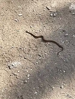 Brown snake | Storeria dekayi | eastern Roberts County (status in question; last formal reported sighting in 1922) | 8 - 15 inches in length, greyish-brown to reddish-brown colouration, with light stripe down the center of the back (bordered by parallel row of dark spots), and dark markings under and/or behind each eye | ![]() |
