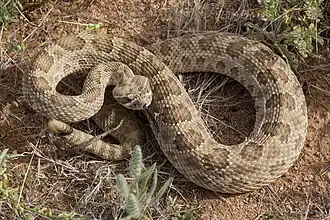 Prairie rattlesnake | Crotalus viridis | throughout that portion of the state west of the Missouri river, as well as in counties adjacent to the river's east bank | 30 - 45 inches in length, South Dakota's only venomous snake (bite is potentially fatal to humans), readily identifiable by rattle segment(s) at the end of the tail, light brown to greenish in colouration, triangular-shaped head with pits located below the midline of each eye & nostril | ![]() |