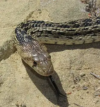 Bullsnake | Pituophis catenifer | All portions of the state west of the Missouri River, all counties adjacent to the east bank of the Missouri River, and across southeastern and central South Dakota | 36 - 72 inches in length, yellowish colouration (with brown or black blotches that appear as rings near the tail) | ![]() |