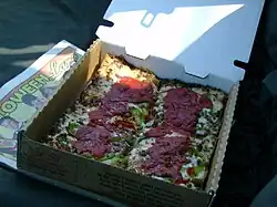 Detroit, Michigan | A style of pizza developed in Detroit, Michigan. It is a square pizza similar to Sicilian-style pizza that has a thick deep-dish crisp crust and toppings such as pepperoni and olives and is served with the marinara sauce on top.[7][8] The crust of a Detroit-style pizza is noteworthy because in addition to occasionally being twice-baked, it is usually baked in a well-oiled pan to a chewy medium-well-done state that gives the bottom and edges of the crust a fried/crunchy texture. |