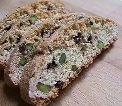 A type of crisp, sweetened bread, made with eggs and baked twice. It is sliced before it is baked a second time, which produces crisp, brittle slices that closely resemble melba toast.[17] The name comes from German zwei ("two") or zwie ("twi-"), and backen, meaning "to bake".[18] Zwieback hence literally translates to "twice-baked". Zwieback is commonly used to feed teething children.[17] |