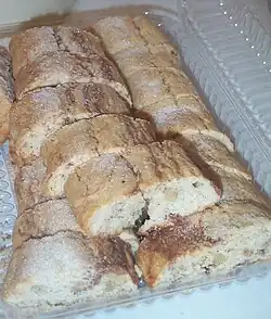 A dessert associated with Eastern European Jews. The Yiddish word mandelbrodt literally means almond bread. It is made by forming dough into a loaf, baking it, slicing the loaf into oblong cookies and baking again. The crunchy, dry cookies were popular in Eastern Europe among rabbis, merchants and other itinerant Jews as a staple dessert that kept well.[10] | |