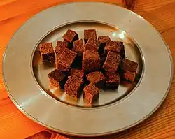 A hard, dry biscuit or a twice-baked bread. It is sometimes used as a baby teething food. The dish has significant international variations. Pictured are rusk squares made of rye sourdough bread. | |