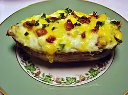Twice-baked potato | Prepared using baked potatoes, the interior of the potato is scooped out after being first-baked. Additional ingredients are added to the potato that is scooped out, and the mix is then placed in the potato shells and baked again.[16] Pictured is a twice baked potato with cheddar cheese, bacon and green onion topping. | ||