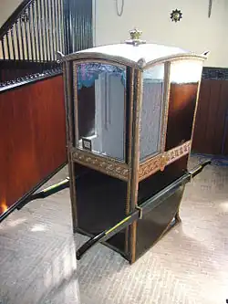 Palanquins vary in size and grandeur. The smallest and simplest, a cot or frame suspended by the four corners from a bamboo pole and borne by two bearers, is called a doli.[3][5] Larger palanquins are rectangular wooden boxes eight feet long, four feet wide, and four feet high, with openings on either side screened by curtains or shutters.[2] Interiors are furnished with bedding and pillows. Ornamentation reflects the social status of the traveller. The most ornate palanquins have lacquer paintwork and cast bronze finials at the ends of the poles. Designs include foliage, animals, and geometric patterns.[4]